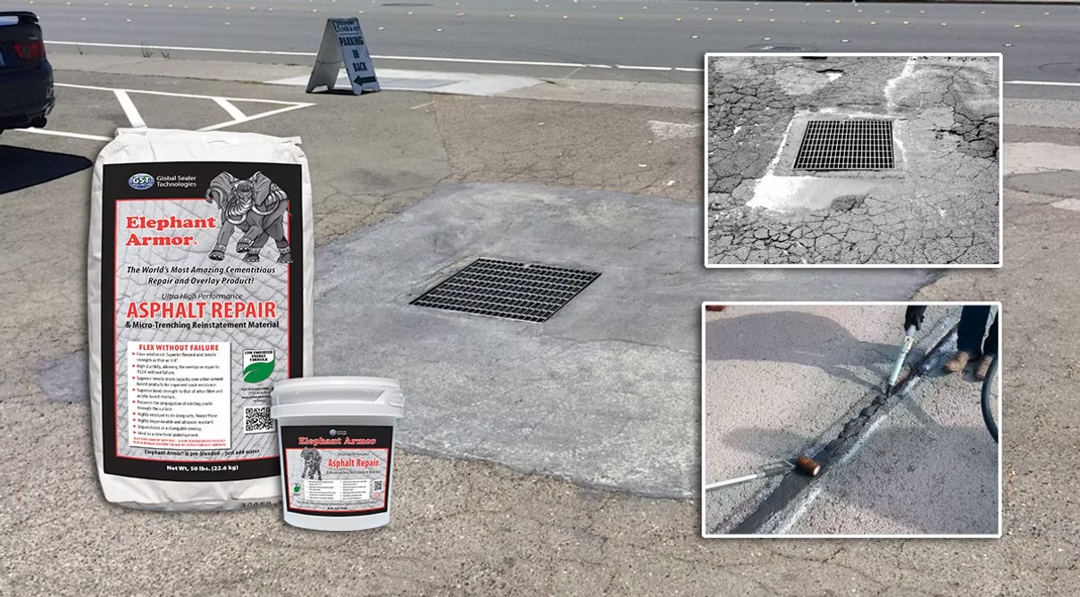 Elephant Armor® Ultra-High Performance Asphalt Repair is a single component, black, all cementitious, fiber reinforced, fast setting mortar
